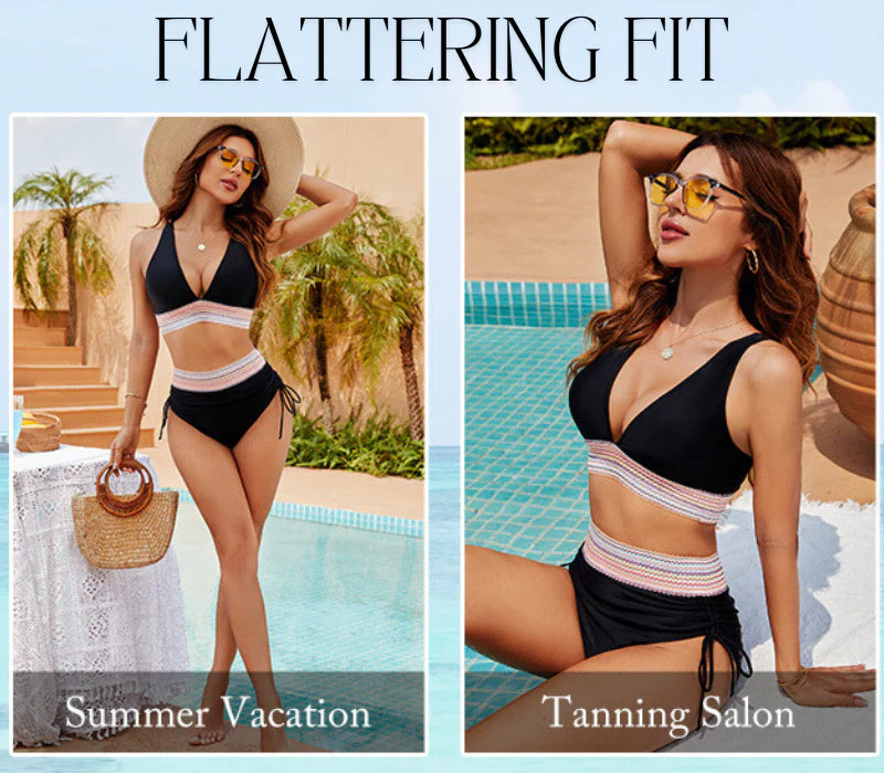 Our high-waisted bikini features tummy control withruched detailing and a wide drawstring waistband, creating a flattering, slimming effect that highlights your waistline. Offering moderate coverage, this design provides the perfectbalance of comfort and confidence, making it ideal for various body types.