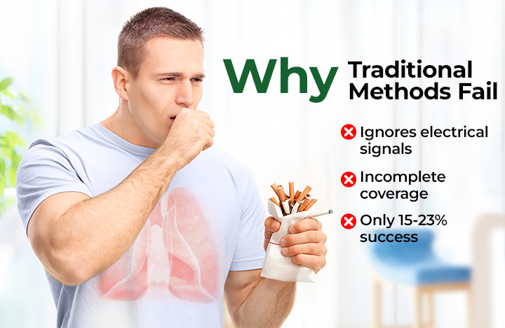 Nicotine addiction operates through three distinct biological systems: chemical dependency, behavioral conditioning, and electrical neural pathways. Most cessation methods like patches (15% success), gum (19% success), and prescription drugs (23% success) only address the first two systems, completely ignoring the electrical component that drives 73% of relapse cases.