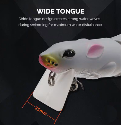 The large tongue is specifically designed to create more water waves and commotion, attracting fish from a distance. As the lure swims through the water, it displaces water in a unique way that mimics a rat’s natural movement, enticing predators to strike.