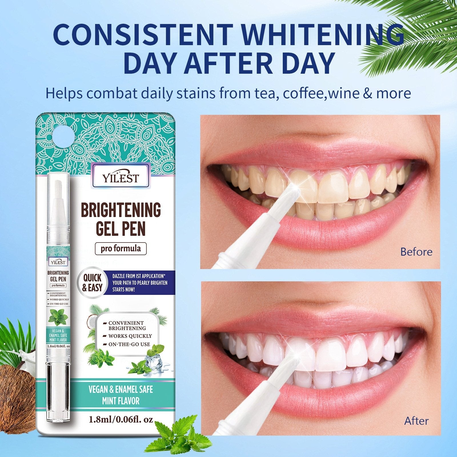 The Teeth Whitening Essence is formulated to erase stains and whiten your teeth without damaging the enamel and gums.